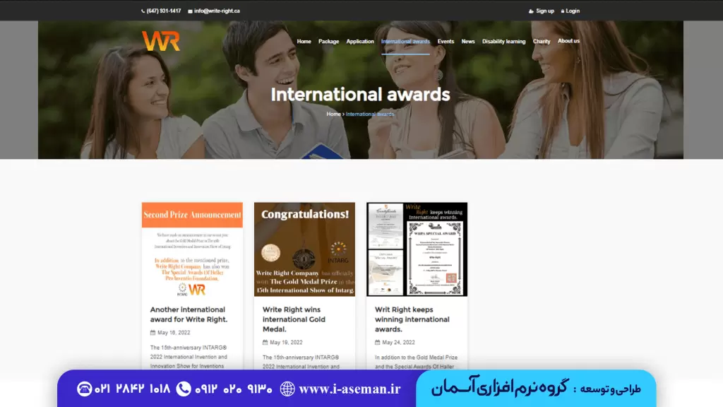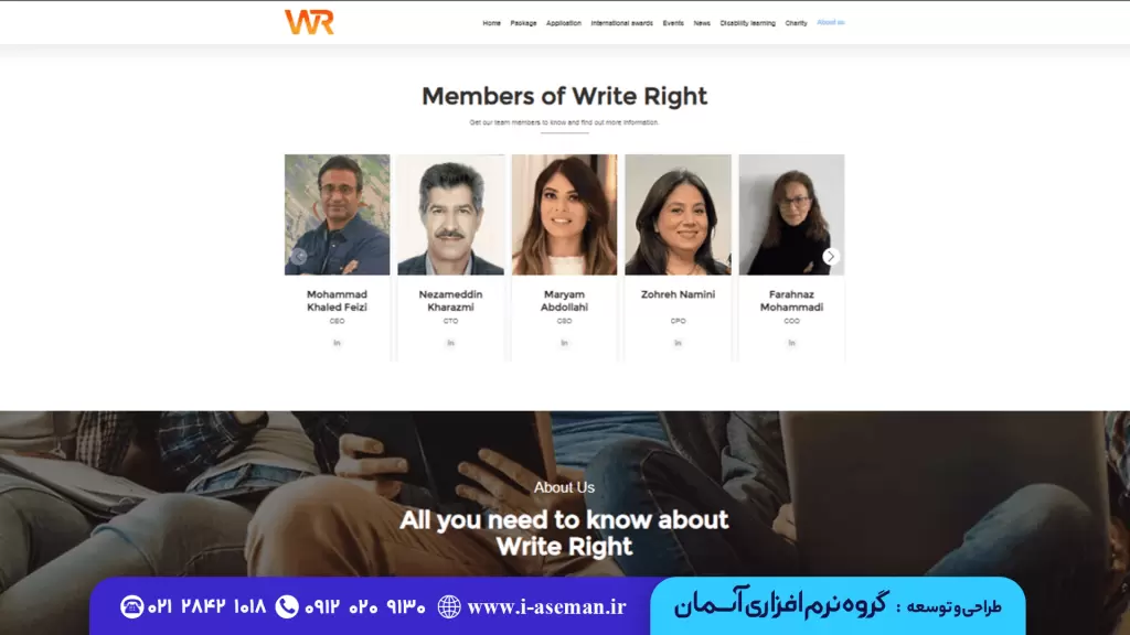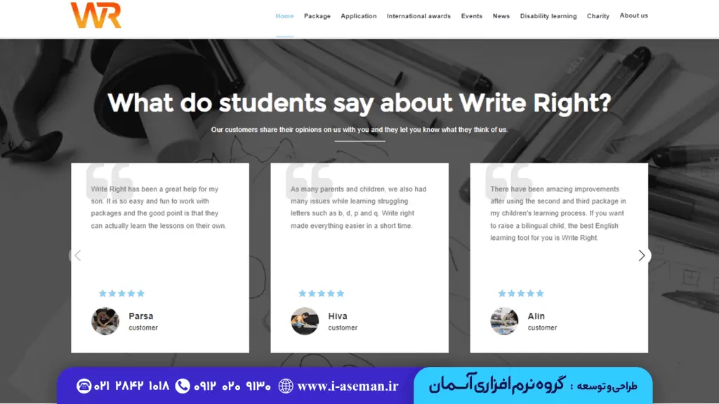 شرکتWrite Right برای طراحی سایت خود، گروه نرم افزاری آسمان را انتخاب کرده است. چرا که آسمان، با قواعد بین المللی طراحی سایت آشناست و می تواند سایتی مطابق با استانداردهای بین المللی طراحی کند.